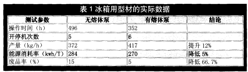 當(dāng)擠出機(jī)運行幾年后,擠出機(jī)內(nèi)部的螺桿和料筒之間會產(chǎn)生很大的磨損,導(dǎo)致其間隙加大。在這種情況下,隨著生產(chǎn)中機(jī)頭壓力的增大,返回熔體量也隨之增大。其結(jié)果是,相對于新的螺桿,產(chǎn)量會下降。此時如果安裝一個海科熔體齒輪泵,就可以使這一問題得到改善。表1是一家公司生產(chǎn)的冰箱用型材的實際數(shù)據(jù)。其材料為ABS加8%的TiO2,最初新的擠出生產(chǎn)線可達(dá)到的最大產(chǎn)量是450kg/h。8年后, 由于螺桿磨損產(chǎn)量減少到了380kg/h。安裝了海科熔體泵后,相關(guān)參數(shù)得到了很大的改善。